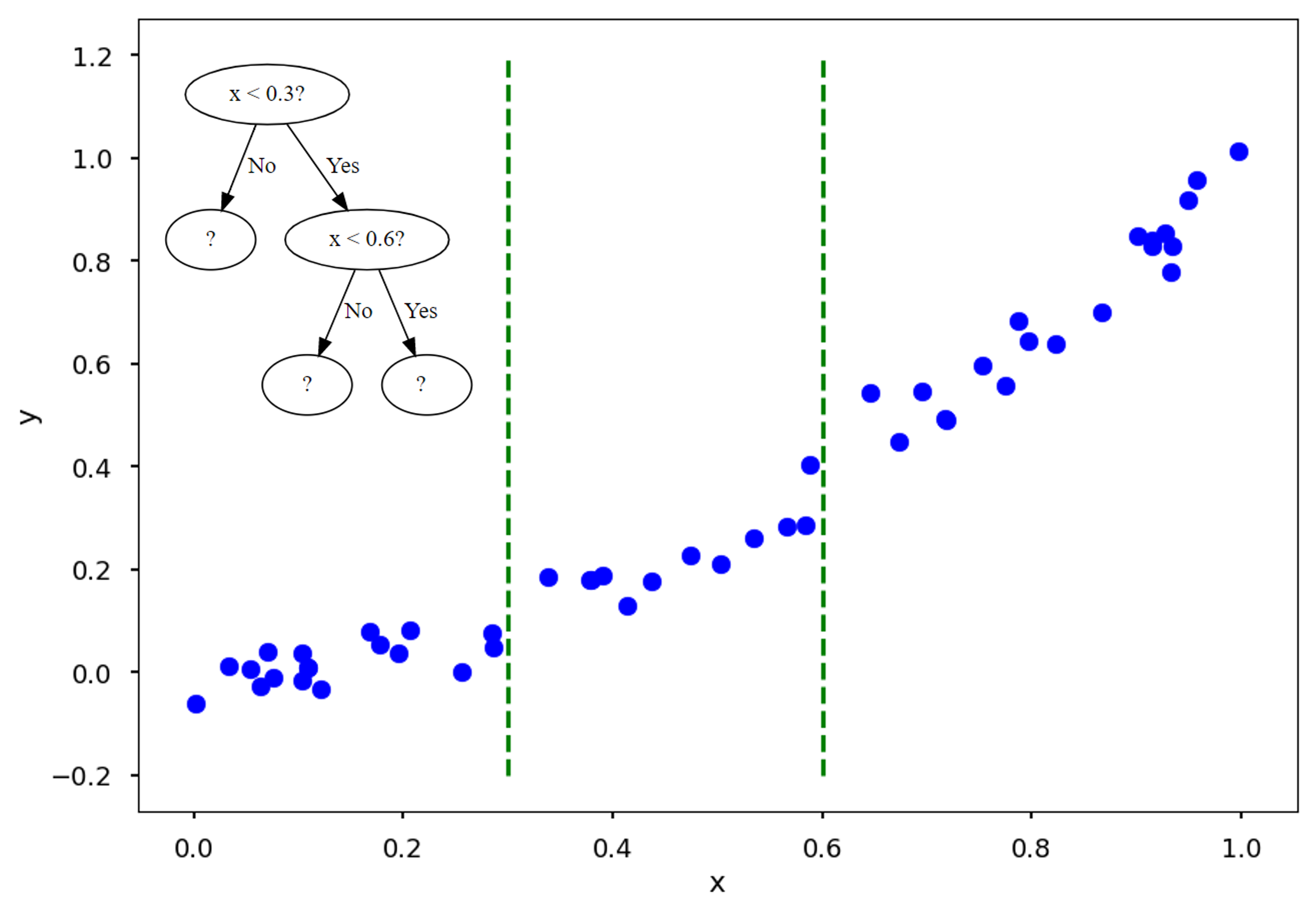 예를 들어 \(x <0.3\) 과 \(x<0.6\)을 노드로 갖는 의사결정 나무는 위와 같이 0.3, 0.6을 기준으로 입력받는 x값을 나누도록 학습합니다 (초록 점선)